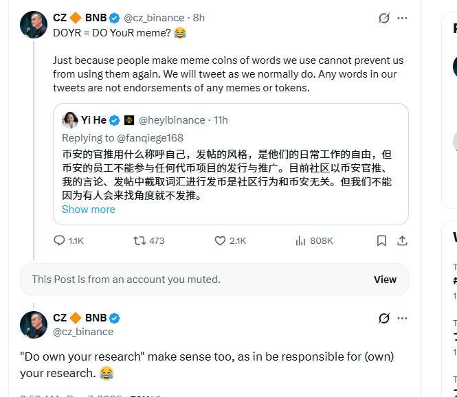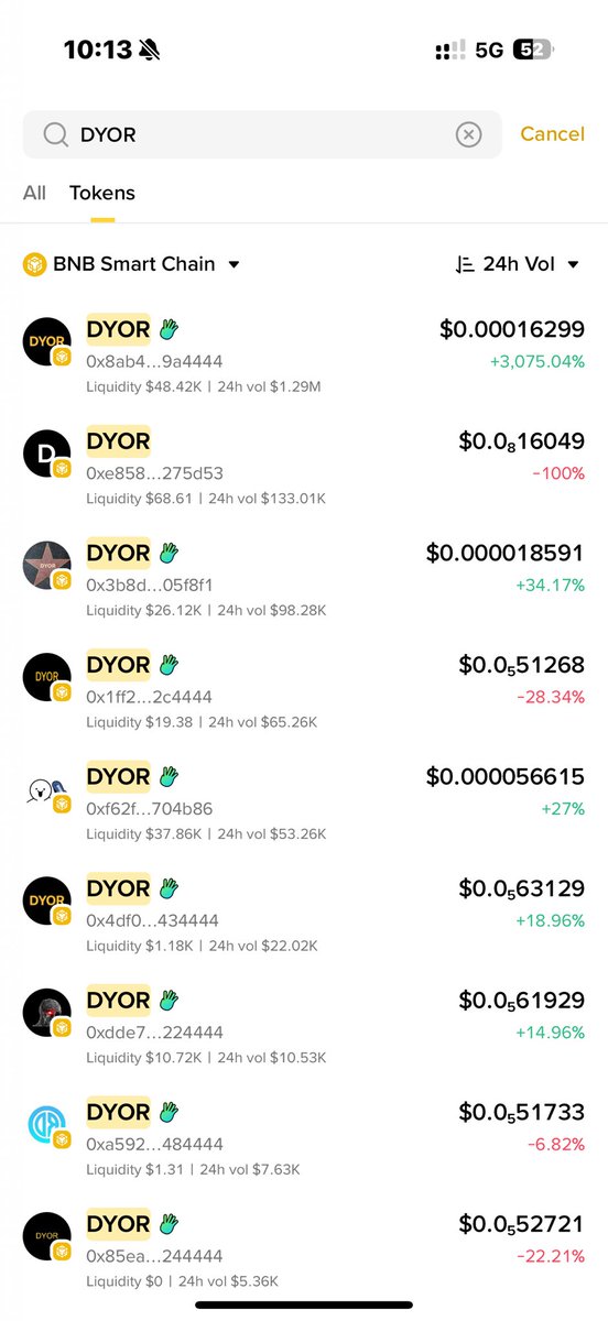 一姐CZ秀互动的这个 $DYOR 为什么在搜索框都出不来呢? 只能通过CA 是什么原理? 该不会是我手机的问题吧 0x925c8ab7a9a8a148e87cd7f1ec7ecc3625864444