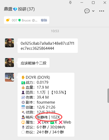 $DOYR 0x925c8ab7a9a8a148e87cd7f1ec7ecc3625864444 投研发出到凌晨的高点 100X 提醒二段后 确定性也比较高,接近3X涨幅;还会有后续的,继续跟着就行 PS:欢迎优秀的伙伴报名投研,有意向带上历史实盘战绩,推特后台私信我---近期会开启 24小时在线语音投研打狗,抓大MEME --------------------------------------------- 新的TG频道看这里: (禁言频道) (聊天群组) PS:新TG频道和群组,会继续同步一级meme行情节奏和二级大行情趋势分析