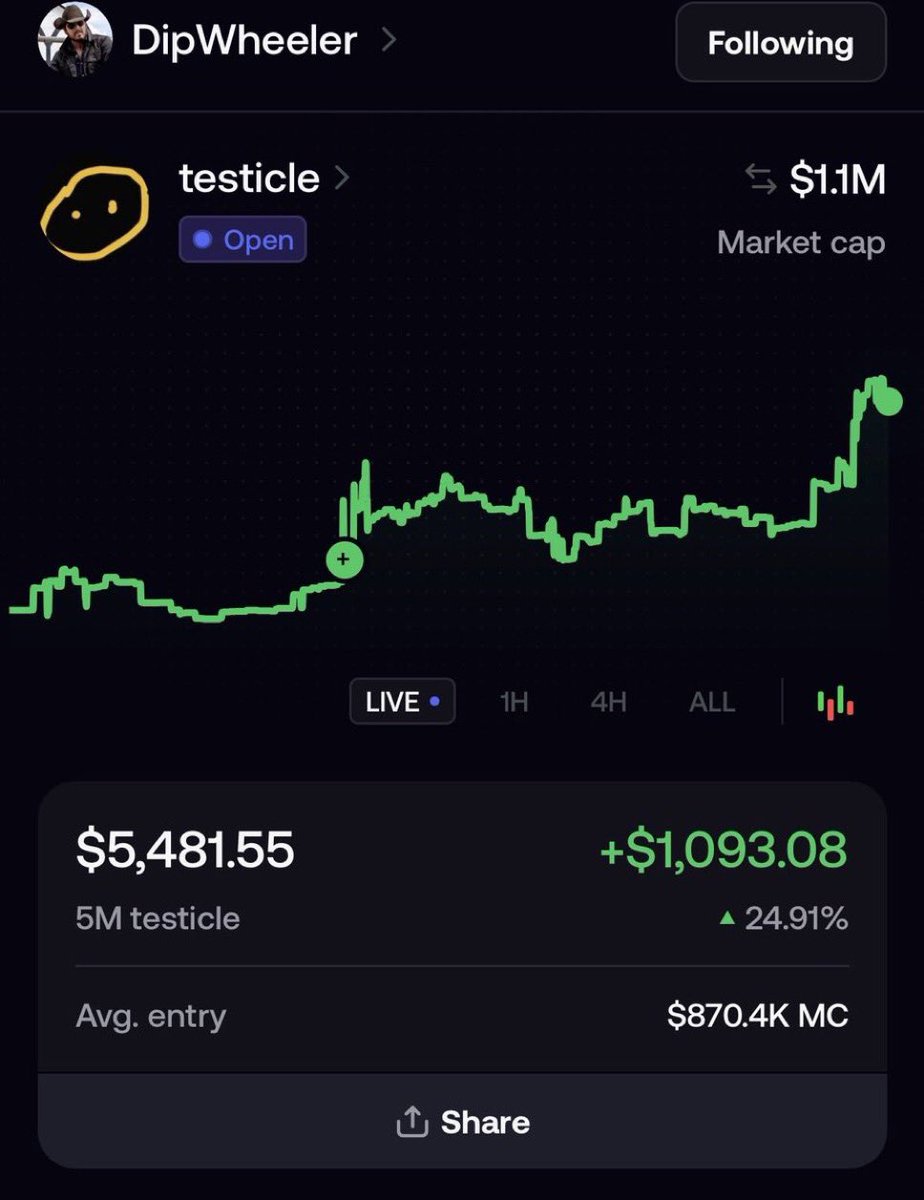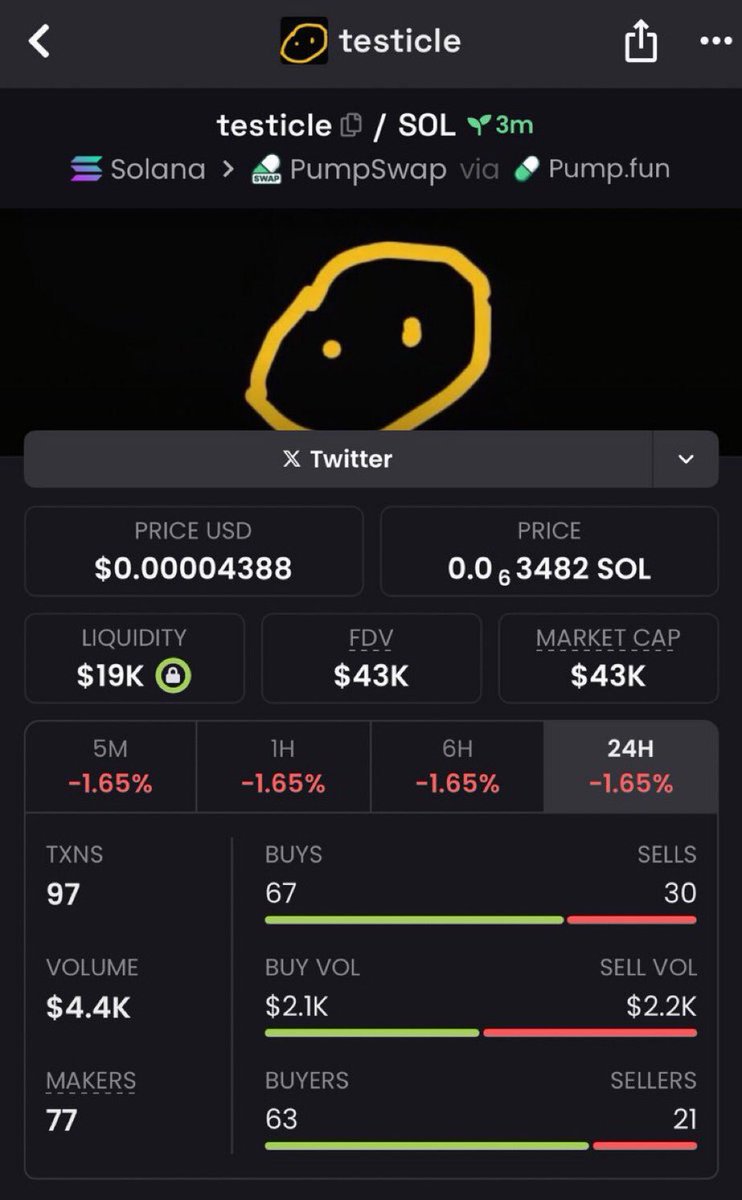Highlighted $testicle to members of my Tg at $43k market cap . Ca: 4TyZGqRLG3VcHTGMcLBoPUmqYitMVojXinAmkL8xpump #testicle #solana #memcoin