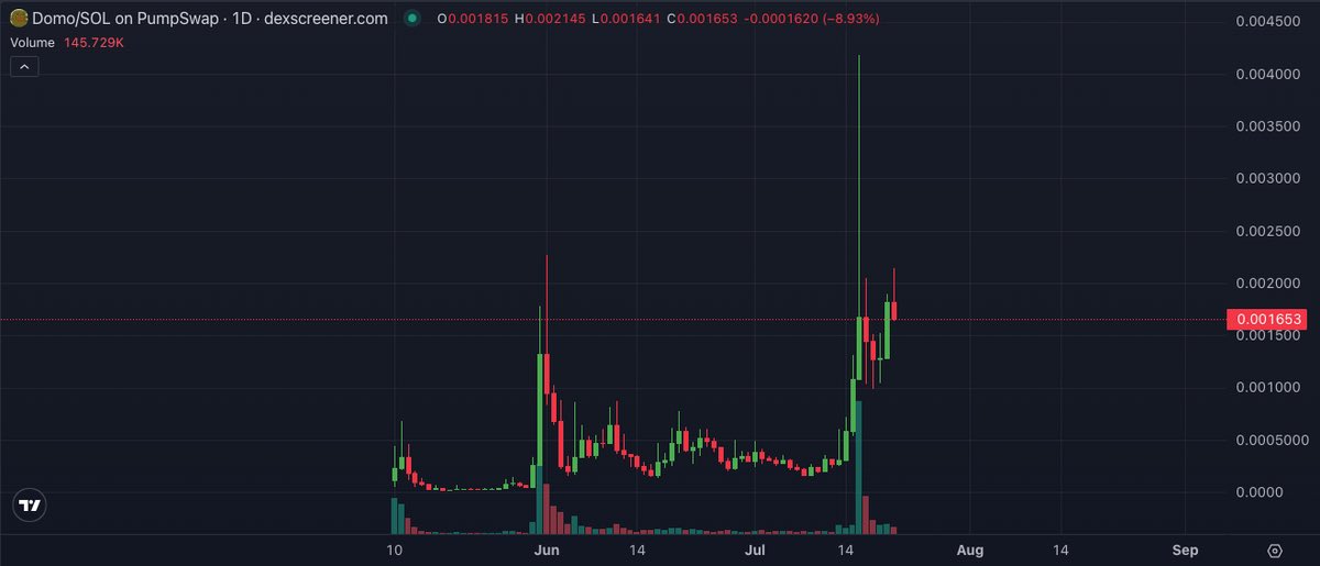 $DOMO: solid 20x off the lows. Thin float, locked liq, meme velocity. Now sitting at $280K mcap with real legs. Structurally, this move looks early. If this is $PEPE energy rerouted on Solana, the multiples aren't done. Chart says higher. Always has.