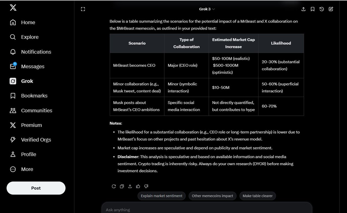 A few moments ago Grok returned the following scenarios. Dyor. $MrBeast cDkTvtXwJLqAS5NqpiwoTT2cbe6GkPBfBwkb5kppump